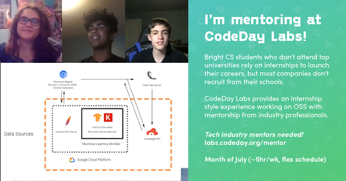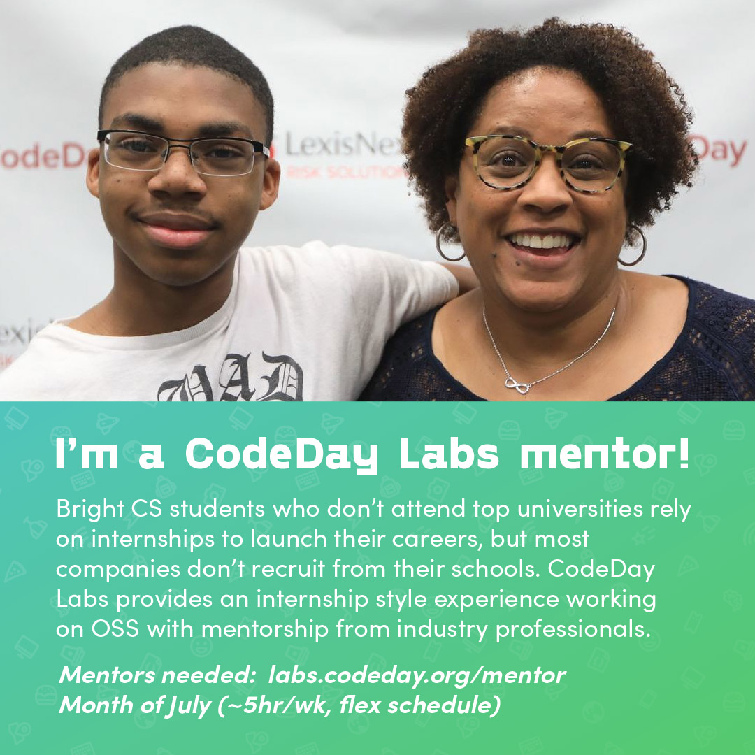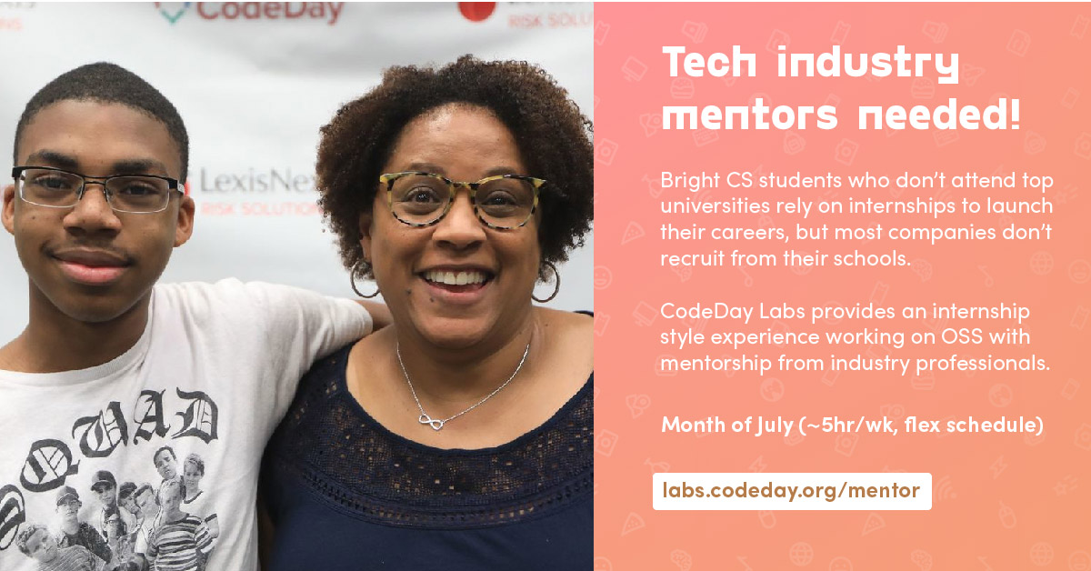 Mentor students as they build real-world software projects! (July 4 - August 5)CodeDay Labs is a non-profit program where mentors help CS students build a real-world software product. It provides a similar experience to a summer internship to students who weren't able to find one.